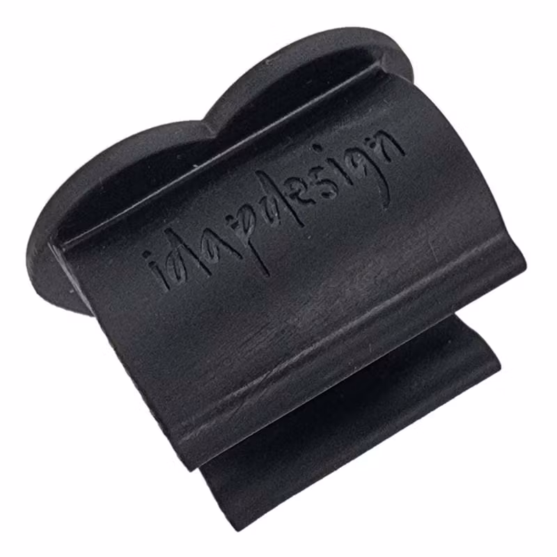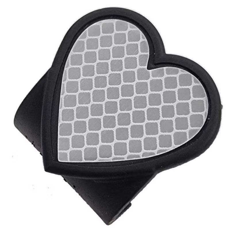 Svarta fästen med ett hjärta. I hjärtat sitter ett klistermärke med reflex i grått.