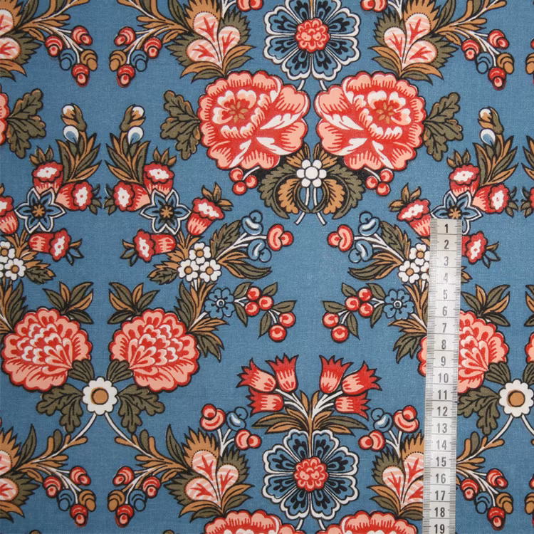 Blå tyg med allmogemönster i olivgrönt, rött, aprikosrosa, senapsgul, vitt och svart. Tyg för sömnad av bältesmuddar.