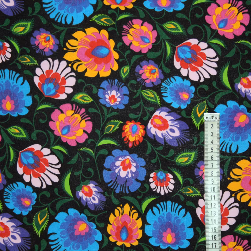 Svart tyg med Polks folklore. Tyg för solskydd till barnvagn.